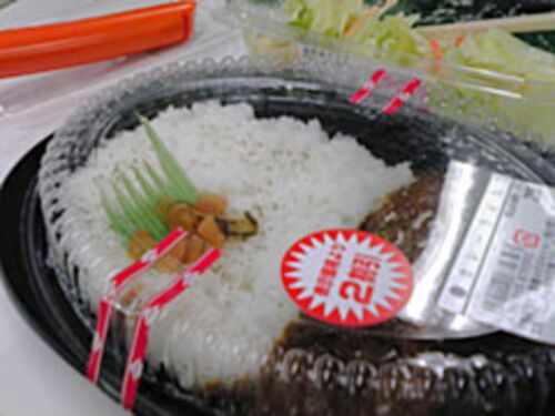 紛失騒動の後だから…という訳ではないのですが、護国寺ポロロッカで2割引(240円?)と460キロカロリーに惹かれてカレーを買って、198円でサラダも買って昼食にしました[E:delicious] たんぱく質は魚肉ソーセージで補給。これは1本50円弱。 さ…