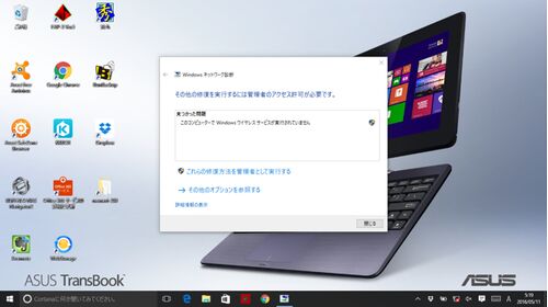 昨日の夕方から、急にWi-Fiに繋がらなくなって、いろいろ検索してデバイスマネージャーか無線LANのプロパティで詳細設定をいじったり…etc でも解決しなかった(T_T) 諦めて、今朝はメーカーのサポートサイトへ質疑を送るために起動してタスクバーのWi-Fiアイ…