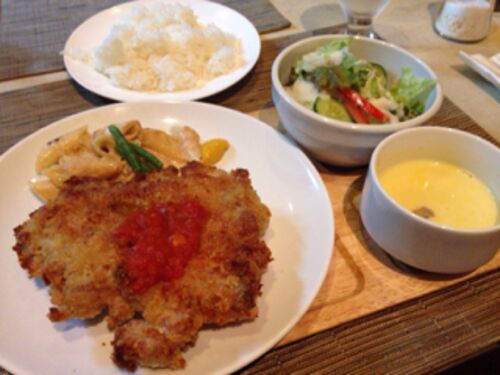 昼はドルフィンでチキンカツレツ☆トマトソースをいただきました。想像してたのより五割増しくらいなカツが出てきて、控えめランチ計画は崩れましたが美味しくて満足です♪ こないだは客が僕一人くらいな日だったのに、今日はほぼ満席で団体さんも居て店の人も…