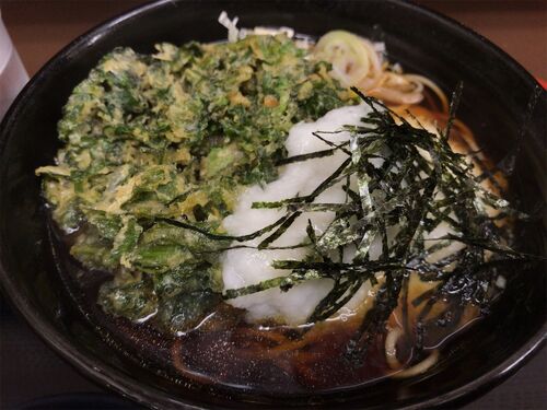 オヤジさんにとろろ蕎麦の食券を出す。追加トッピング券は「春菊天orげそ天」、腹から声を出して「春菊をお願いします」と伝えると、オヤジさんニコッとして『やっと春菊が入りましたよ〜♪』と、やけに嬉しそうである。 春菊が切れること1ヶ月以上か?、話…