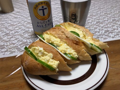 帰宅後は卵サンドにオールフリー🍺😄🥪 今週は仕事もプライベートも盛りだくさんでバタバタしました。ようやく週末、仕事もなんとか目処をつけて来週に繋げて土日は遊びモードでリフレッシュします🐙✨ 明日のテニスに備えてアルコールは控えて早く寝ます💤 テニスラン…