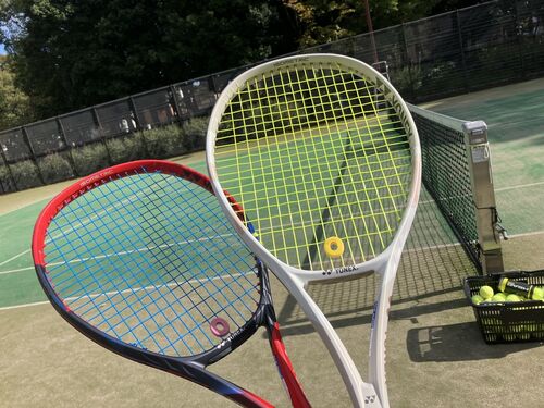 先日買ったラケットで打ってきました。白っぽいのが新色のサンドベージュ☆ いままで使っている赤のストリングスが張って1年経っているので打感は硬く感じましたがテンションが違うのだから仕方ない。主にストロークとサーブで違和感で、ボレーの飛びは良い…