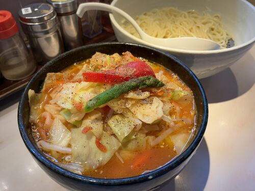 アスパラとベーコンのトマト塩つけ麺 今月は事情によりテレワーク多めだったり、出社日が月曜だったり(店休日)、出社した際に歩いて行ったら臨時休業だったりと、なかなかタイミングが合わなくて4月の季節メニューを味わえなかったのですが、ようやく美味…