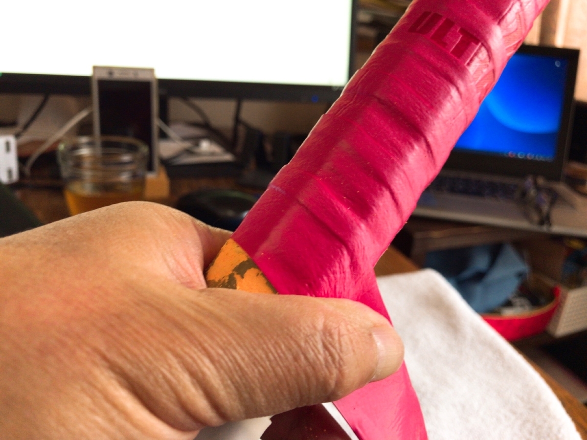 こないだの朝練でグリップテープが乾いてきたなと思ったので巻き替えました。けっこうシットリしましたが、ウェットすぎる感じもします。テープが古くてネットリしているのかもしれません💦 テニスの頻度が減ってから買い足していないですしね…。