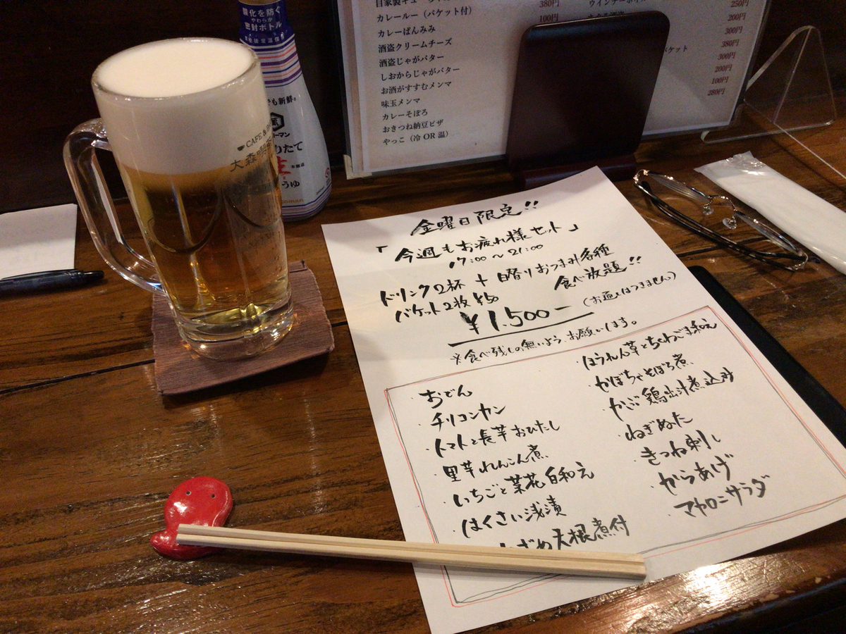 久々に寄りましたね。金曜日のセットはドリンク2杯におばんざい食べ放題が付いてきてたいへんお得ですが食べ残しのないように注文しましょう!